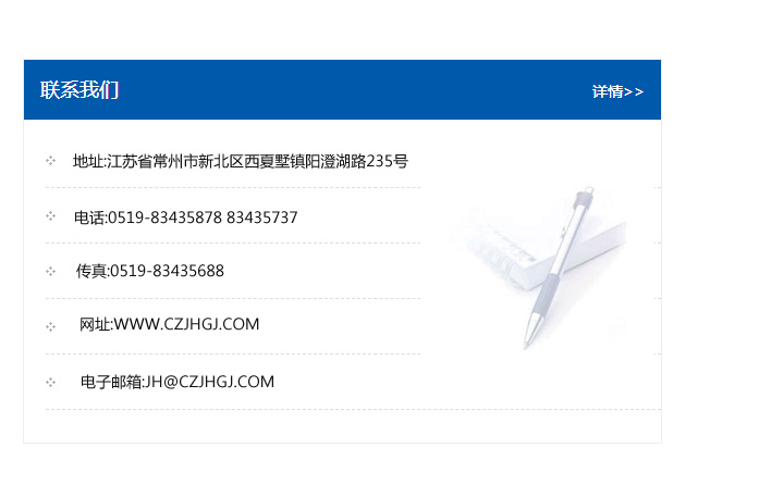 地址:常州市新北區友邦商務大廈1幢16、17層  電話:0519-85101652  傳真:0519-85112595  郵編:213022  網址:www_cz-jiayue_cn.lnhldrc.com  郵箱:xiajifengaa@163.com